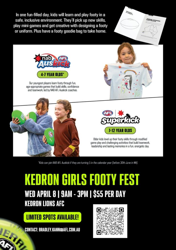 👉 Secure your place now: https://www.playhq.com/afl/org/kedron-girls-footy-fest-holiday-program/fff72d9a/register