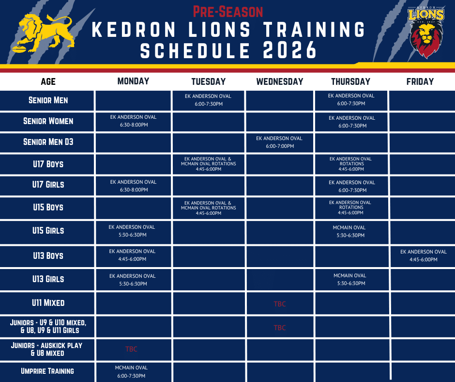 Kedron Lions Training Schedule